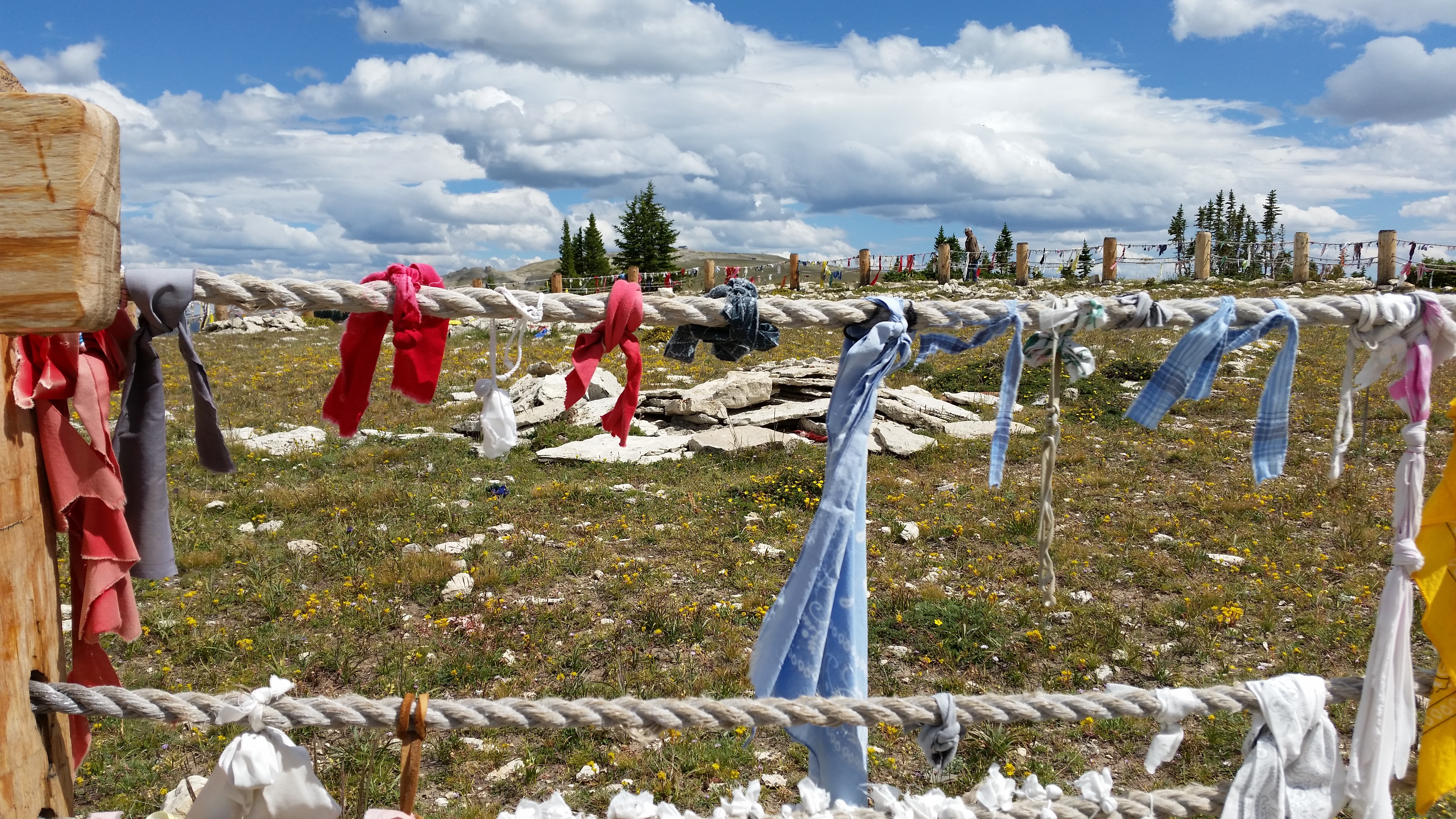 20150724_152659 Published July 11, 2016 at 5312 × 2988 in About last summer, Part 4-The Big Horns and Medicine Wheel ← Previous Next → The wood and rope fence around the wheel is decorated with all sorts of ceremonial tokens