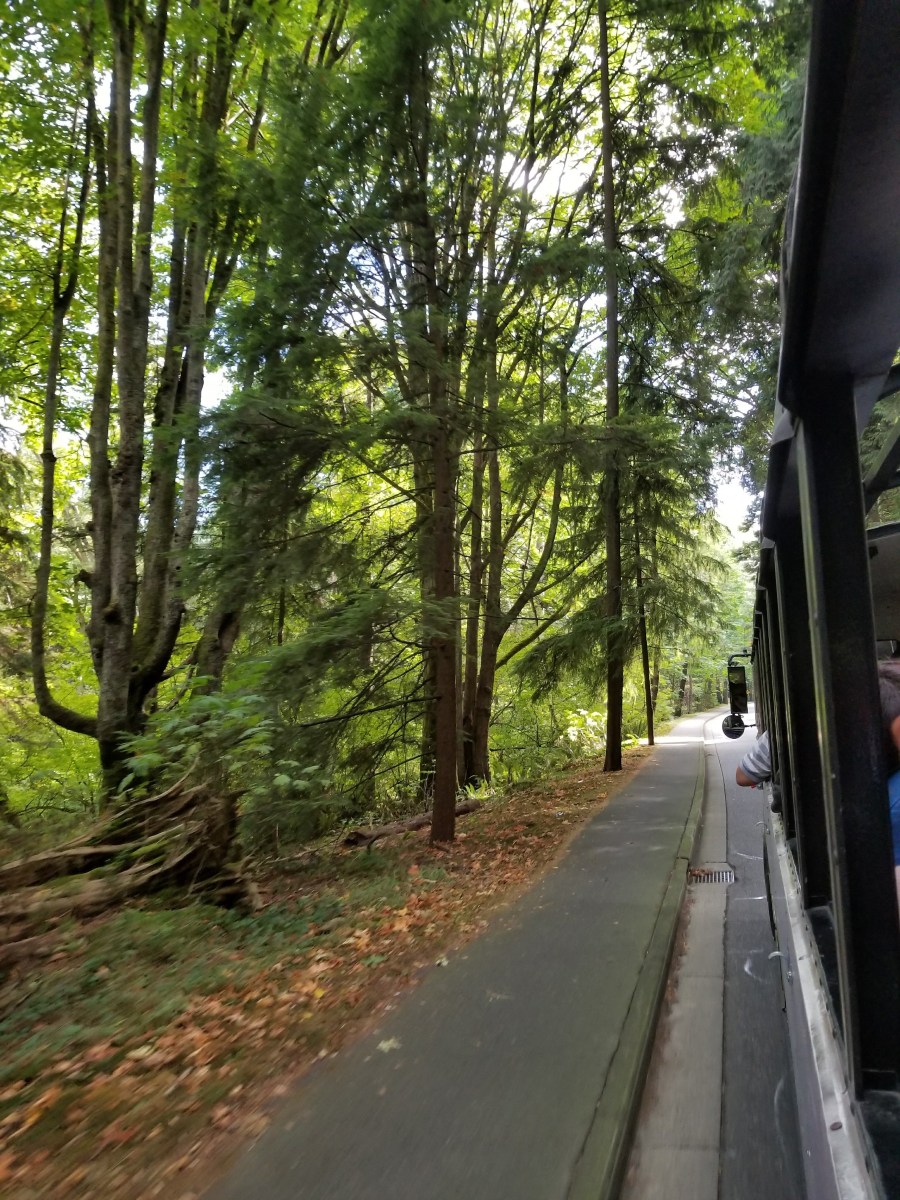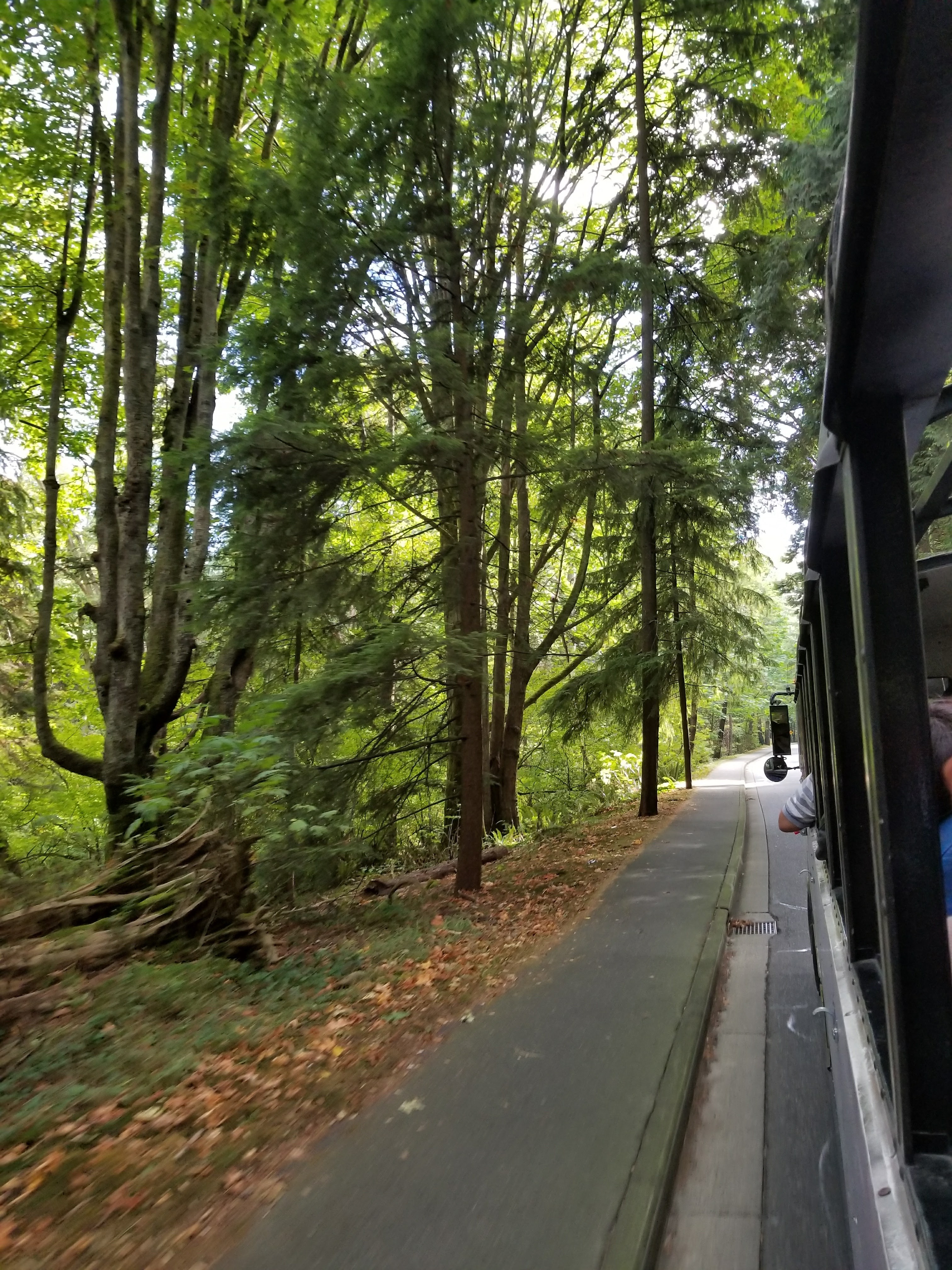 Riding the bus through the evergreens